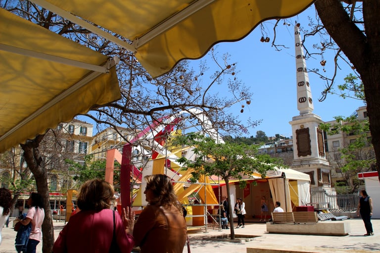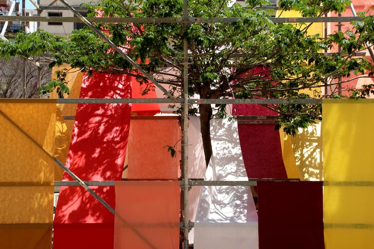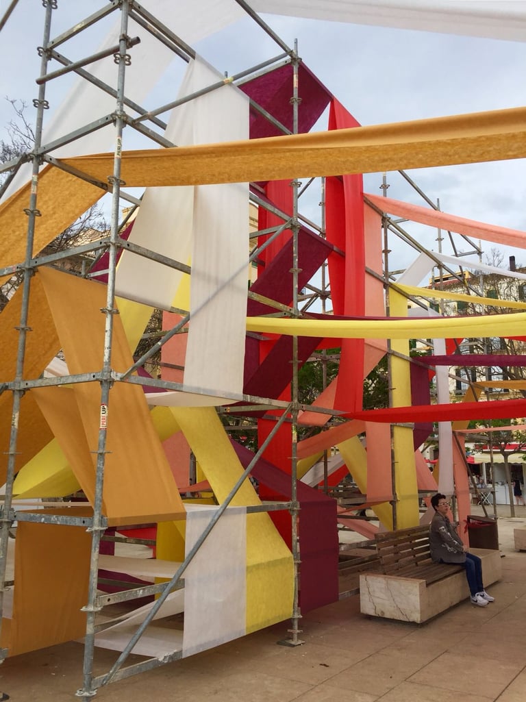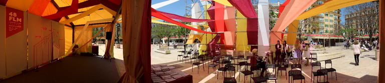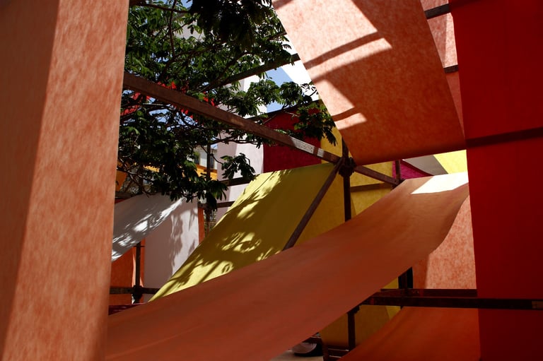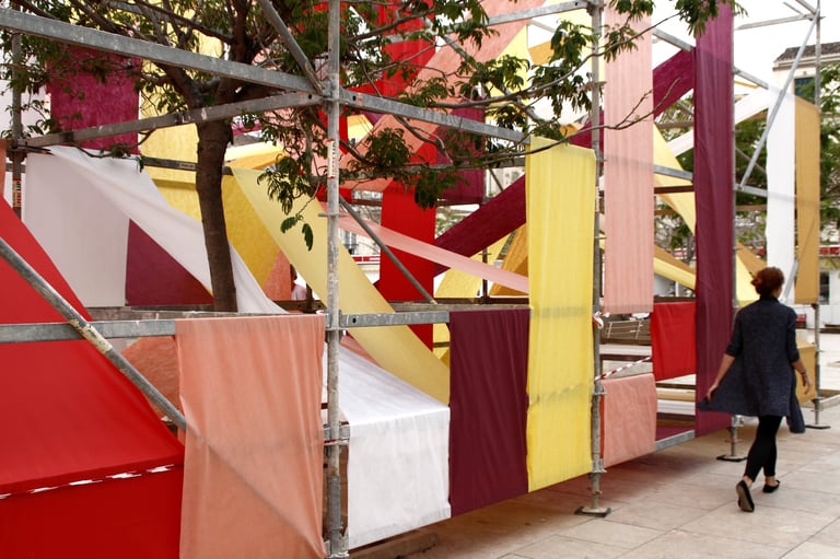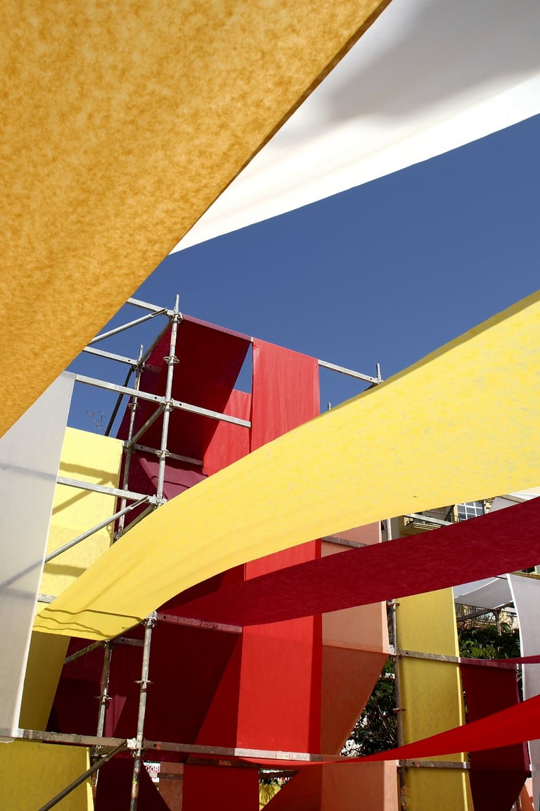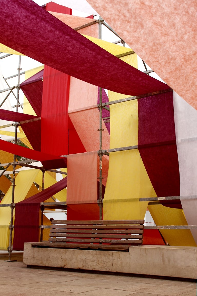 Este pabellón del libro en Málaga utiliza una estructura ligera de andamiaje combinada con coloridas lonas textiles para crear un espacio sombreado y acogedor para la Feria del Libro. Desarrollado mediante un proceso de diseño generativo, el pabellón equilibra creatividad y funcionalidad, garantizando la sostenibilidad a través de una huella mínima, componentes de andamiaje reutilizables y telas totalmente reciclables. El resultado es una instalación efímera adaptable que enriquece el evento cultural mientras minimiza el impacto ambiental.