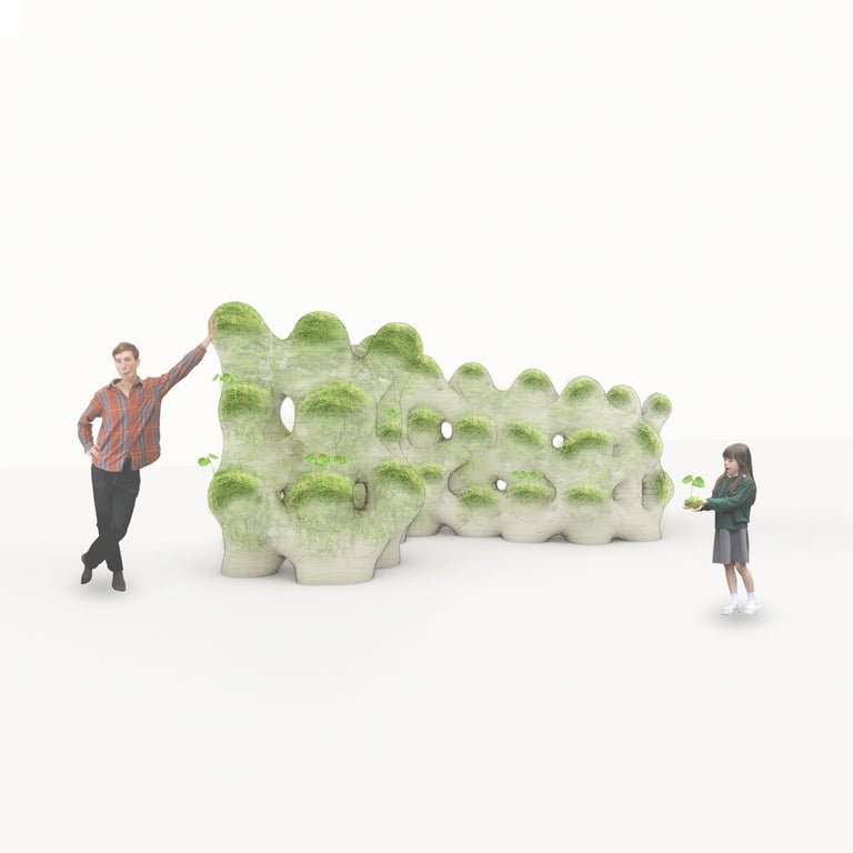 Estructuras cerámicas impresas en 3D e inspiradas en el sistema de refrigeración tradicional del botijo, diseñadas para sostener el crecimiento del musgo para la purificación natural del aire.