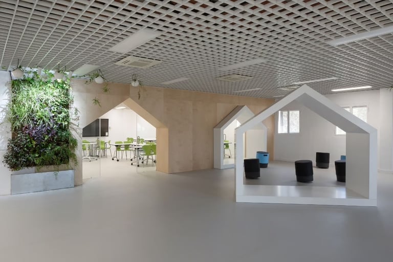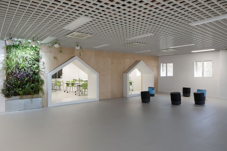 La propuesta final integra luz natural, muros verdes y componentes reconfigurables para fomentar la creatividad, la interacción y pedagogías adaptativas.