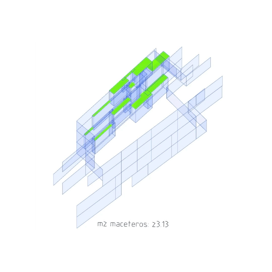 En HC56, un oasis de luz y vegetación emerge dentro de un tejido urbano denso, con 56 viviendas organizadas alrededor de una serie de patios comunitarios. A través de un flujo de trabajo generativo basado en datos, cada patio fue diseñado paramétricamente para optimizar la cantidad, distribución y densidad de la vegetación, equilibrando jardineras, zonas verdes y la entrada de luz para mejorar la vida cotidiana. Las proporciones resultantes crean una relación armoniosa entre el espacio construido y la naturaleza, garantizando áreas comunes luminosas, cómodas y biofílicas.